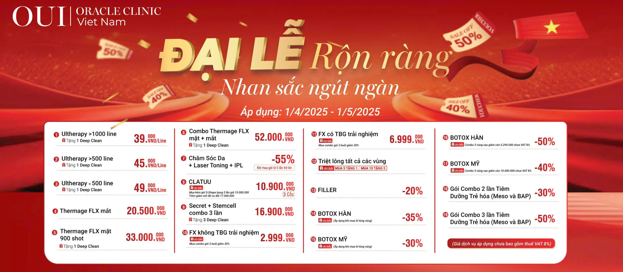 Đại lễ năm nay, OUI | Oracle Clinic Vietnam sẽ mang đến những chương trình ưu đãi đặc biệt như một “tấm vé nâng cấp nhan sắc” dành riêng cho bạn trong mùa Đại lễ 30/4 – 1/5 này: Ultherapy chỉ từ 39.000đ/Line Thermage FLX mắt chỉ 20.500.000đ Thermage FLX mặt 900 shot chỉ 33.000.000đ […]