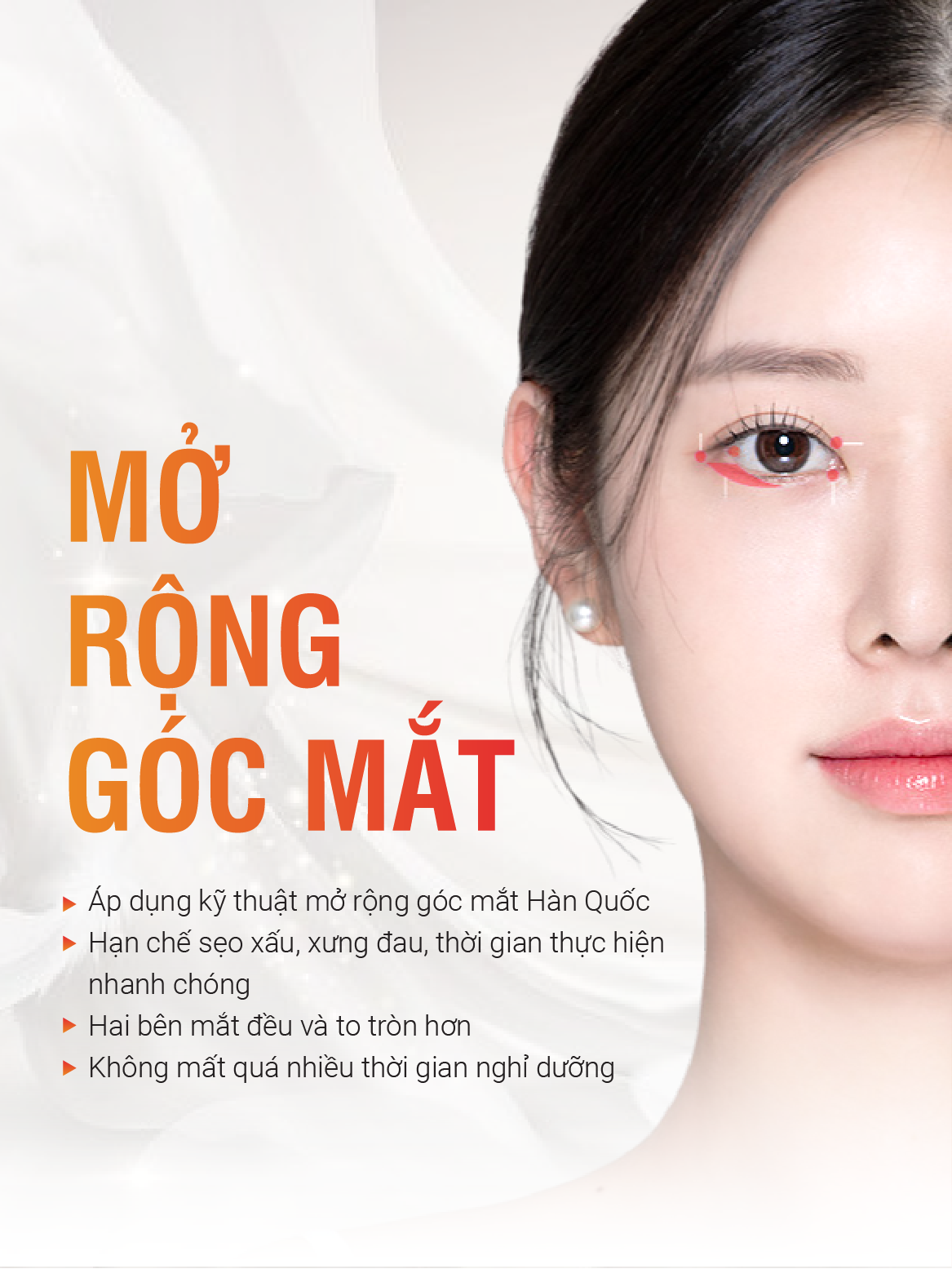 Mở rộng góc mắt là phương pháp nhằm mở rộng diện tích 2 bên mắt, để mắt được to tròn và đều hơn. Theo đó, bác sĩ sẽ tiến hành bóc tách và mở rộng góc mắt trong hoặc ngoài (Tùy vào yêu cầu của khách hàng) bằng kỹ thuật chuyên môn. Phương pháp này chỉ tác động vào phần da bên ngoài của mắt, tuyệt đối không can thiệp vào cấu trúc mắt, do đó không hề ảnh hưởng đến thị lực.