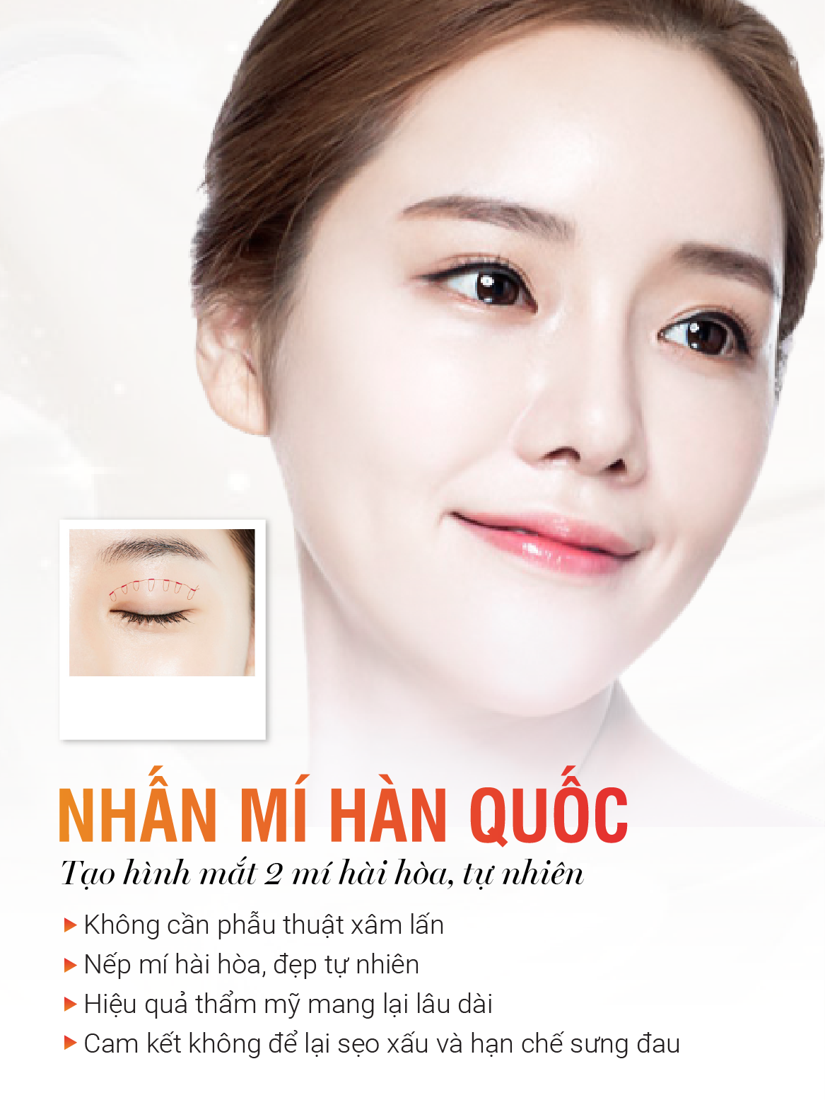 Nhấn mí Hàn Quốc hay còn được gọi với cái tên khác là bấm mí Hàn Quốc, tạo hình mắt 2 mí không phẫu thuật. Giúp khách hàng sở hữu đôi mắt to và đều nhau.