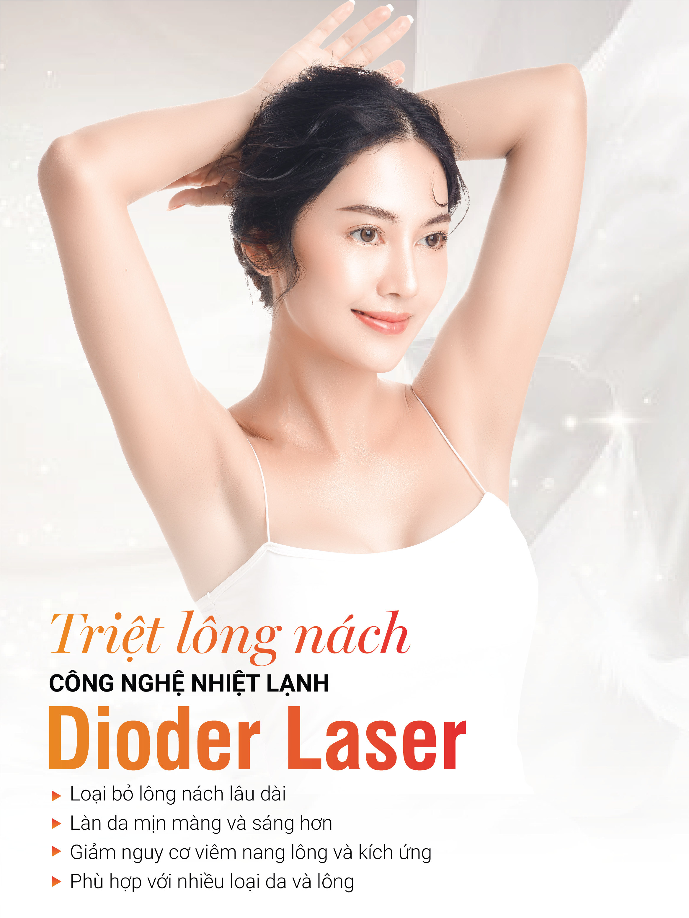 Triệt lông nách Diode Laser là phương pháp hiện đại được ưa chuộng, bởi khả năng triệt tận gốc, hạn chế lông mọc lại và mảnh hơn. Không chỉ thế, việc triệ t lông bằng công nghệ Diode Laser còn giúp làm giảm mùi và thâm tại vùng da nách, hạn chế tình trạng viêm nang lông.