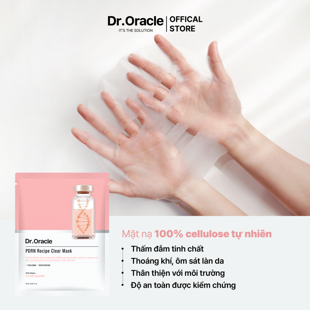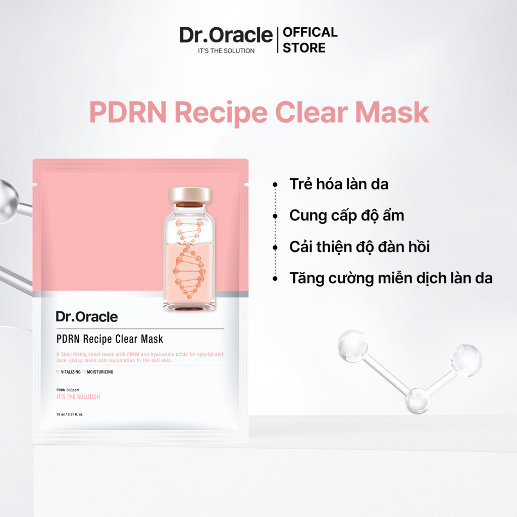 Mặt nạ giấy PDRN Recipe Clear Mask chứa PDRN, một thành phần được chiết xuất từ DNA cá hồi, giúp thúc đẩy quá trình hỗ trợ tái tạo và hỗ trợ phục hồi da, cung cấp độ ẩm sâu, cải thiện độ đàn hồi và làm sáng da.