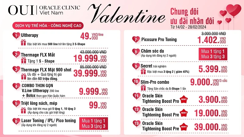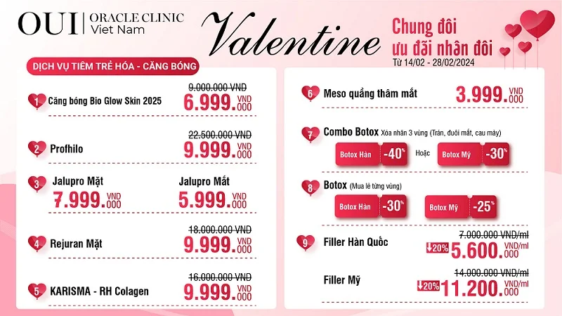 Valentine năm nay, Oracle Clinics Of OUI gửi tặng đến các chị em cơ hội làm đẹp độc quyền với ưu đãi nhân đôi, để các nàng tự tin tỏa sáng trong mùa yêu. Chi tiết chương trình Valentine chung đôi ngay tại đây, hoặc quý khách hàng có thể liên hệ hotline 0898 77 44 77 để được hỗ trợ tư vấn thêm.